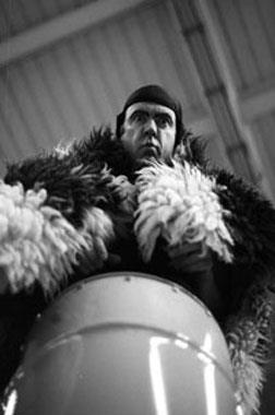 Ölfass auf die Bühne trägt: Ein tapsiger Kerl in